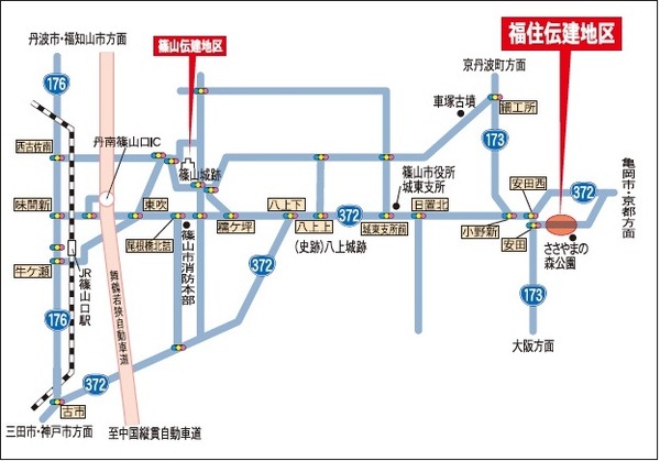 【自動車 : 福住伝建地区】 国道372、173号線の交差点から東へすぐ。 京都縦貫自動車道「亀岡IC」から車で西へ約40分。 駐車場は多紀支所の駐車場(無料)などをご利用下さい。 【自動車 : 篠山伝建地区】 |