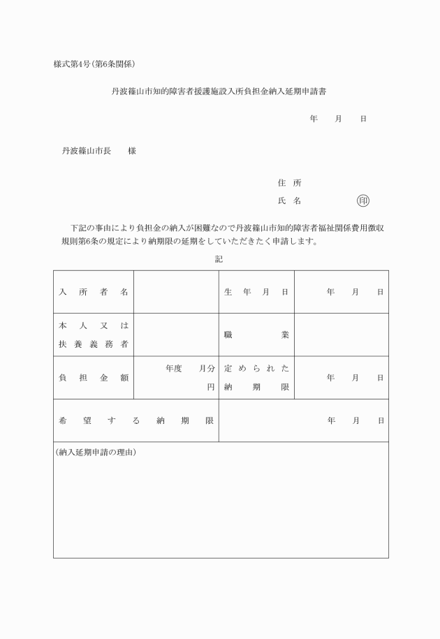 第6条 市長は、本人又はその扶養義務者が特別な事情により負担金を納期限までに納入することが著しく困難であると認めるときは、期日を指定して当該負担金の納期限を延期することができる。