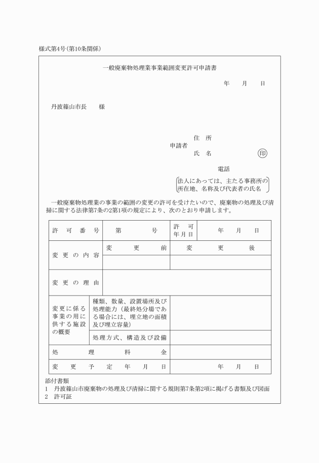 第10条 法第7条の2第1項の規定により、一般廃棄物処理業の事業の範囲の変更の許可を受けようとする者は、一般廃棄物処理業事業範囲変更許可申請書(様式第4号)に許可証を添えて市長に提出しなければならない。