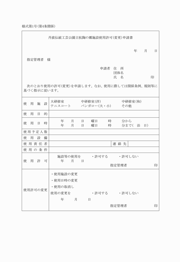 第5条 陶の郷の使用の許可を受けた者(以下「利用者」という。)がその取消し又は変更をしようとするときは、速やかに指定管理者に申請し、許可を受けなければならない。
