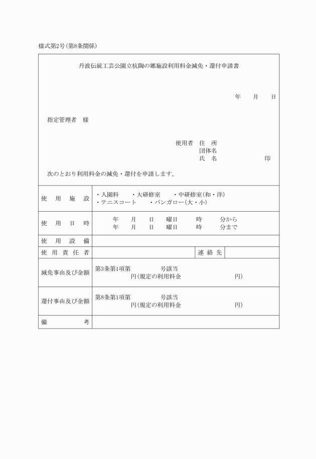 第8条 条例第9条又は第10条の規定により、使用料を減免又は還付(以下この条において「減免等」という。)することができる場合及びその額は、丹波篠山市公の施設使用料条例施行規則(平成14年篠山市規則第25号)第4条又は第9条の規定を準用する。