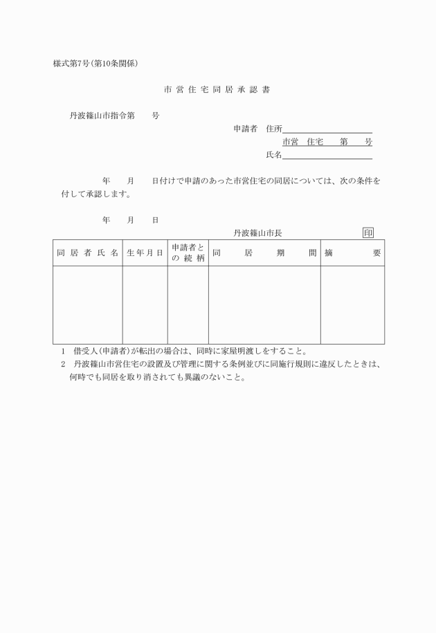 第17条 条例第28条ただし書、第29条第1項ただし書又は第60条の規定により市営住宅の用途変更等の承認を得ようとする者は、様式第20号の市営住宅用途変更等承認申請書を市長に提出しなければならない。