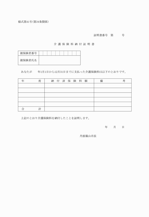 第34条 保険料の納付証明を受けようとする被保険者は、介護保険料納付証明書交付申請書(様式第40号)を提出しなければならない。