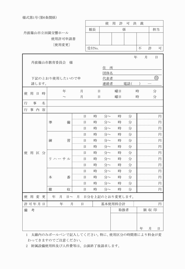 第7条 交響ホールの使用の許可を受けた者(以下「利用者」という。)がその取り消し又は変更をしようとするときは、速やかに使用許可書を添えて教育委員会に申請しなければならない。